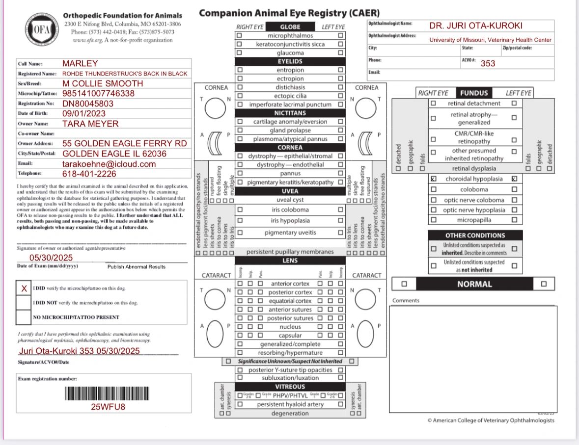 OFAs of hips and elbows will be completed at 2 yrs of age. Marley is young and we not have plans to breed him until completion.